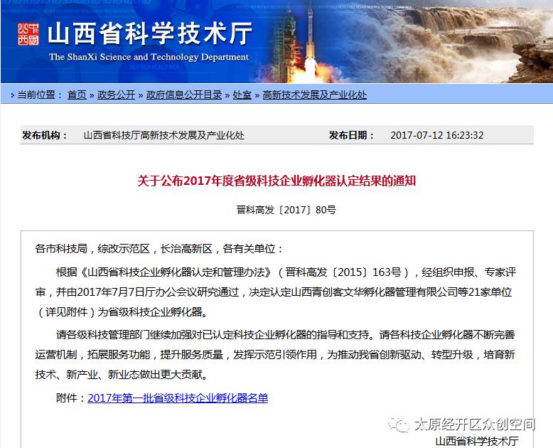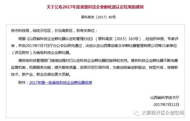 在山西省科技廳、太原市科技局、晉中市科技局、山西轉型綜合改革示范區創(chuàng )新發(fā)展部、太原市小店區科技局、中國郵政集團公司太原市分公司等上級單位的大力輔導支持下,眾創(chuàng )空間科技集團迎來(lái)了重磅喜訊。7月12日,眾創(chuàng )空間科技集團旗下的太原經(jīng)開(kāi)眾創(chuàng )孵化器管理有限公司和晉中眾創(chuàng )家園網(wǎng)絡(luò )科技有限公司被省科技廳正式認定為2017年第一批“省級科技企業(yè)孵化器”,與此同時(shí),集團旗下山西眾創(chuàng )家園科技有限公司運營(yíng)的太原郵政眾創(chuàng )空間被省科技廳正式認定為2017年第一批“省級眾創(chuàng )空間”。這是省科技廳對眾創(chuàng )空間科技集團的又一次肯定和對本集團創(chuàng )業(yè)創(chuàng )新工作的認可,也是眾創(chuàng )空間科技集團在平臺資質(zhì)提升進(jìn)程上的又一里程碑。